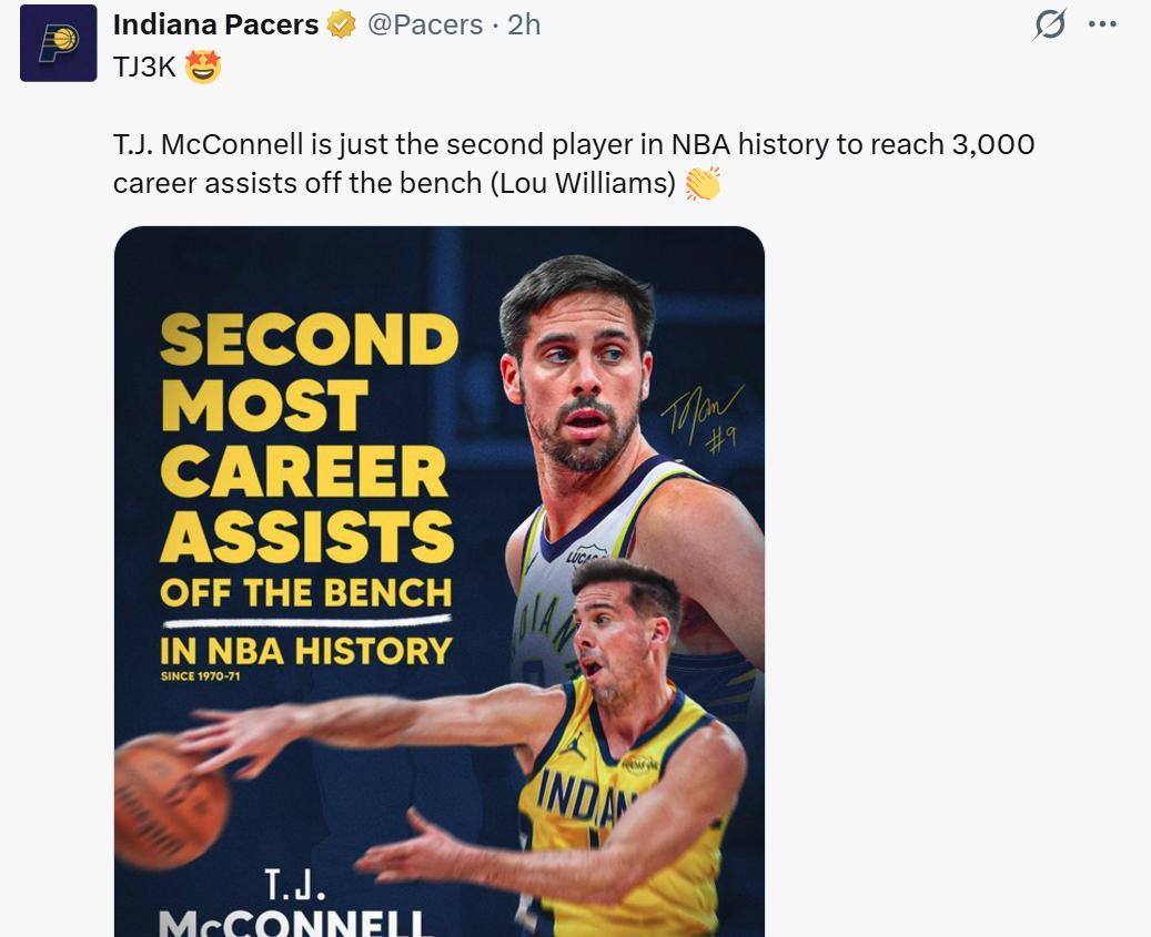同为落选秀的TJ麦康奈尔也是在加盟步行者队后打出名堂,本场TJ麦康奈尔8中4拿下8分2板的同时送出9次助攻,成为NBA历史上第二位以替补身份送出至少3000次助攻的球员,第一位是超六路威。